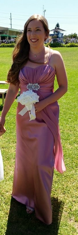 I’ve had a hectic week this week, especially the last few days. My sister got married yesterday and I was a bridesmaid, which means I didn’t get to write but I did get to wear a pretty dress and get my hair and make-up done, which was a treat for me because I hardly wear make-up or get my hair done. (A usual trip to the hairdresser for me involves getting a trim and that’s about it.) Here’s a pic of my sister and her new husband, and one of me. (I cut it done because I was holding the hand of the flower girl and I don’t like to share pics of kids on the internet.)